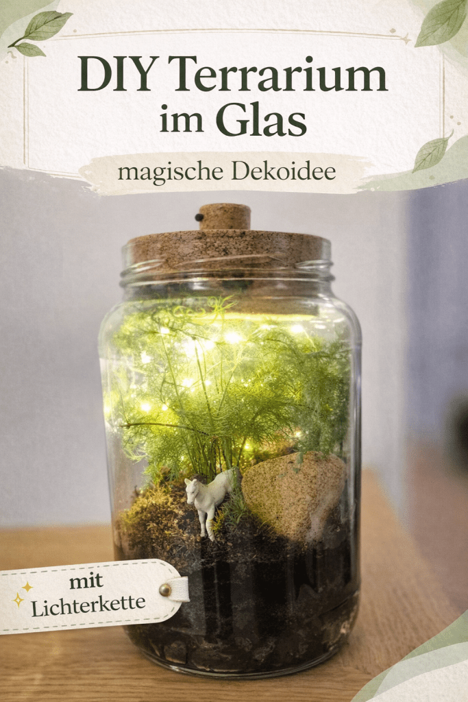 Besonders zauberhaft wird das Terrarium, wenn du es mit einer kleinen Lichterkette ergänzt. Dann wird aus dem DIY-Projekt nicht nur eine hübsche Deko, sondern sogar ein kleines Nachtlicht fürs Kinderzimmer. ✨ Gerade am Abend sieht das Glas mit seinem sanften Licht einfach wunderschön aus und schafft eine gemütliche Atmosphäre.