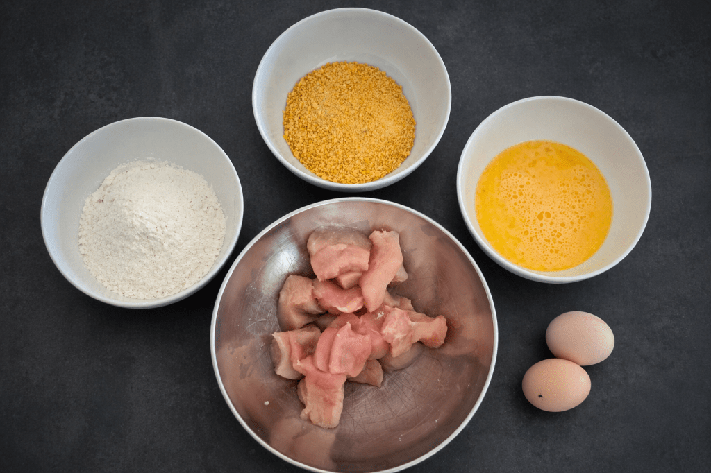 - Hähnchenbrust abtupfen, Sehnen entfernen und in Nugget-Größe schneiden.